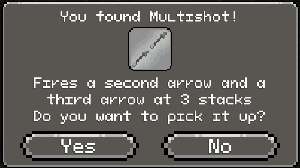 The problem we encountered with that format was that once someone had figured out the most optimal arrow upgrades they would never even consider picking up another upgrade. How did we counteract this? We added a timer to the upgrades to encourage picking them up more frequently and not relying on the same tools the entire game. Elemental weaknesses on enemies were also added, though these did not end up making a huge impact as we didn’t indicate them well enough.